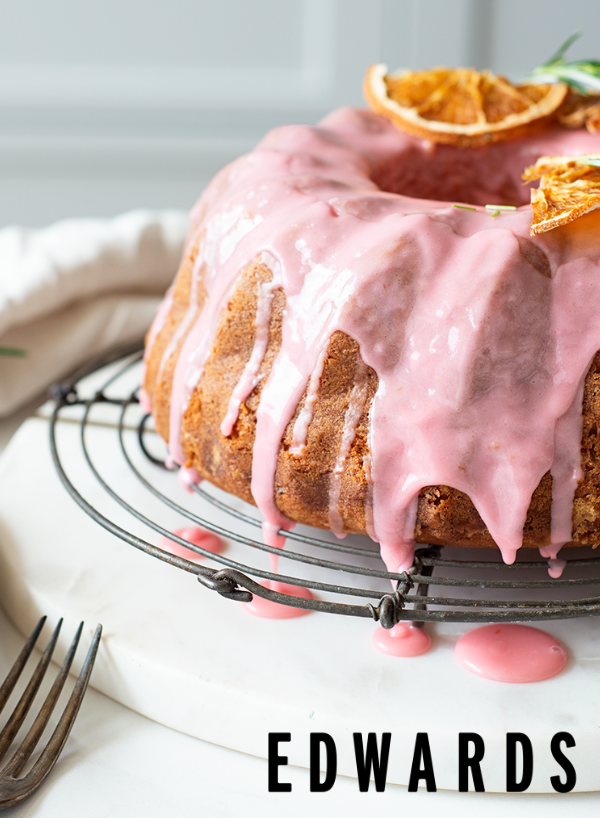 With blood oranges in season, now is the perfect time to make this gorgeous cake. With its sticky syrup and drizzled pink icing in a classic bundt cake tin we think you'll find it takes afternoon tea up a level! We found our Edwards Australian Dried Oranges the perfect garnish, alongside a sprig of rosemary from Mandy's garden.