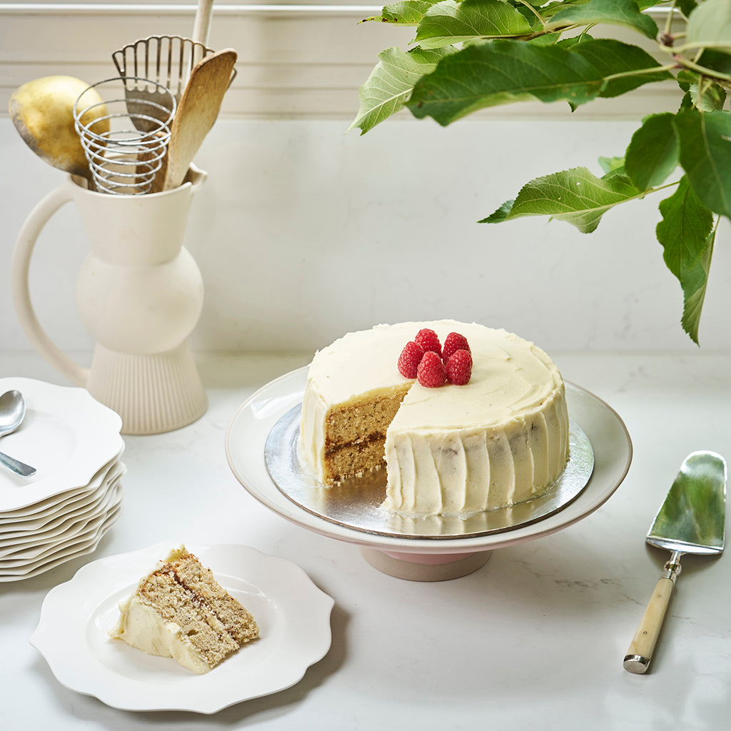 A decadent blend of toasted hazelnuts and bright raspberries, our Hazelnut Raspberry Cake features soft almond-hazelnut cake layers filled with raspberry preserve, rich ganache, and silky Swiss meringue buttercream. Elegant, nutty, and perfectly balanced with fruity freshness.